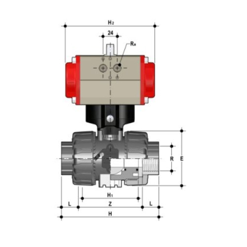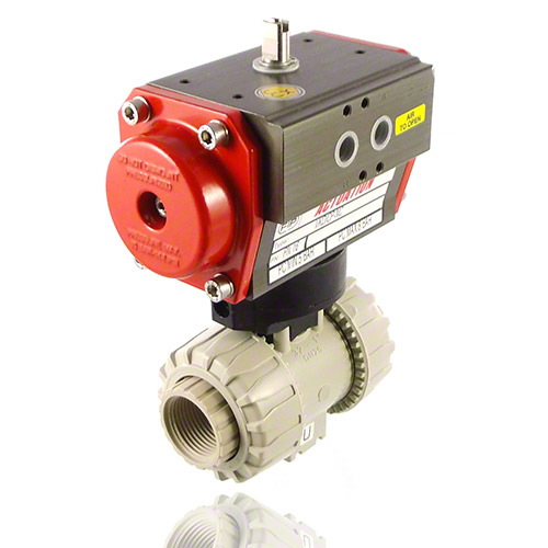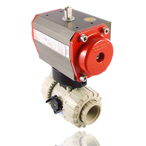 2/2-Wege-Kugelhahn mit gesicherten Überwurfmuttern aus PP mit pneumatischem Stellantrieb