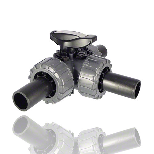 PVC-U 3-Wege-Kugelhahn, L-Bohrung, PE100-LS-Stutzen, FPM
